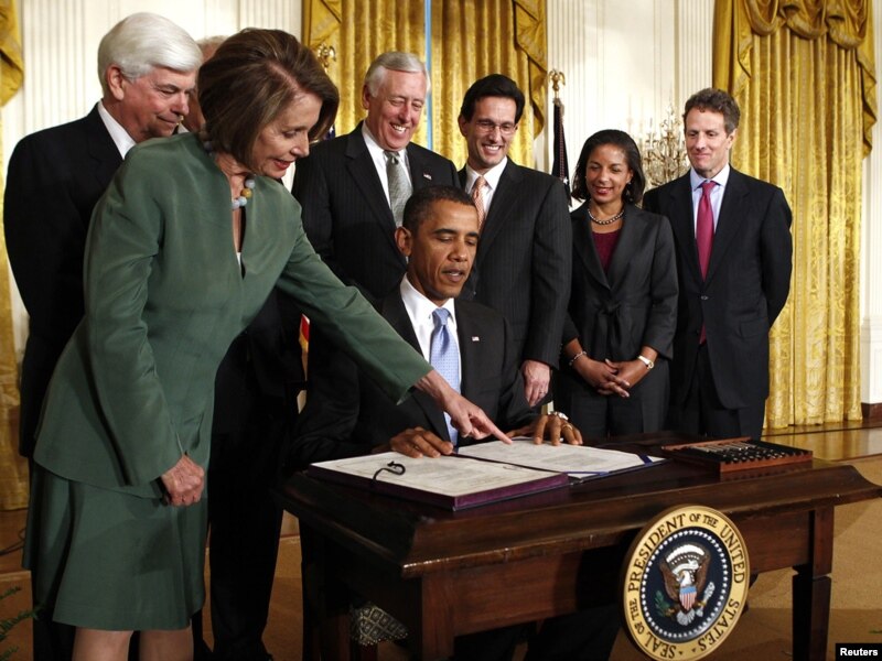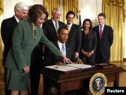 U.S. - Speaker of the House Nancy Pelosi leans in as U.S. President Barack Obama signs the Iran Sanctions Act at the White House in Washington, 01Jul2010